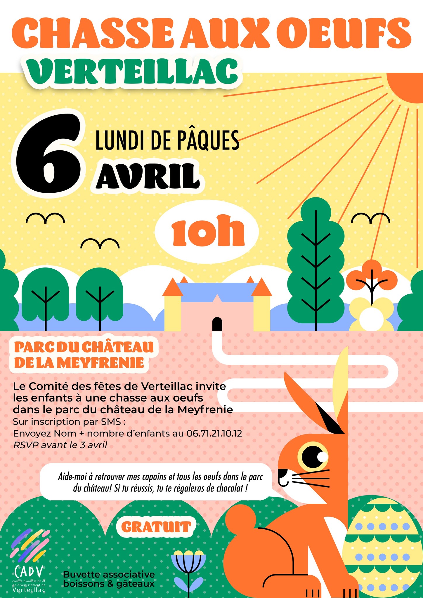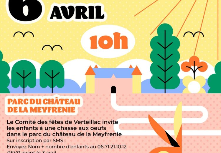 Egg hunt in the grounds of Château de la Meyfrenie, refreshment bar with drinks and cakes, registration required (name + number of children) before 3 April, free of charge
