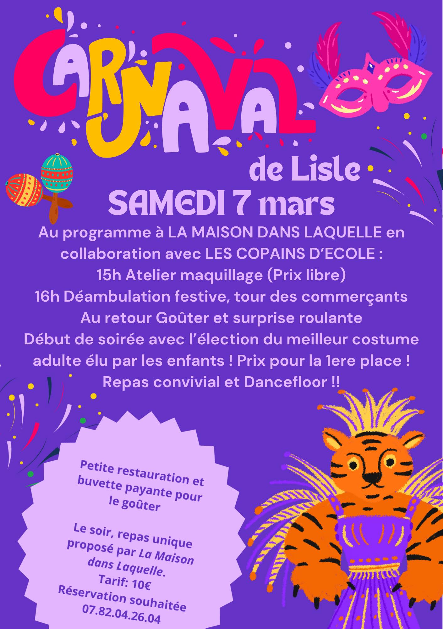 A vos agendas et plus beaux déguisements ! La Maison dans Laquelle en collaboration avec Les copains d’école de Lisle vous donne rendez-vous le samedi 7 mars pour une belle journée de fête carnavalesque !