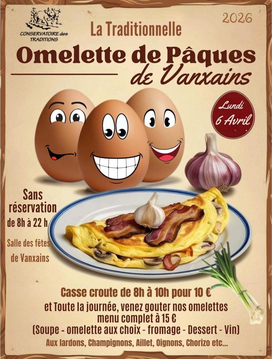 toute la journée, venez déguster les différentes omelettes (oignon, aillet, champignons de Paris, lardons, chorizo…) – Tarifs : formule « »Omelette casse-croûte » » à 10 € de 8h à 10h, formule complète à 15 € de 10h à 22h : soupe, omelette au choix, fromage, dessert et vin compris (sans réservations)